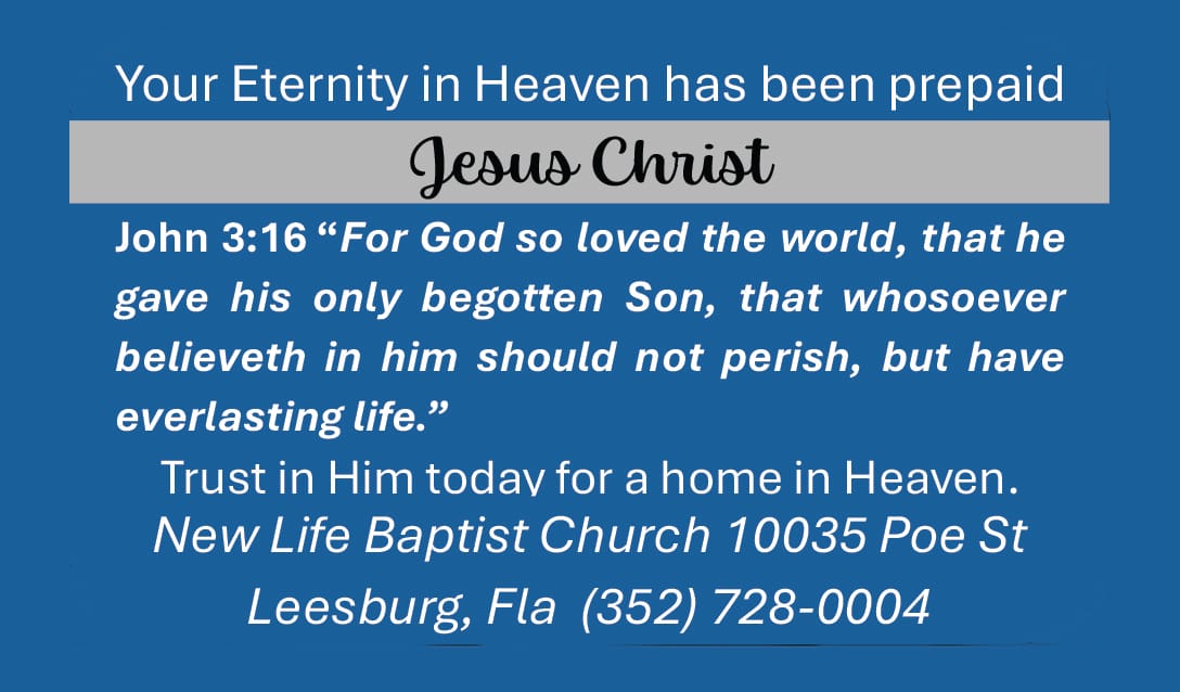 Do you travel through Florida? Please stop by, we would love to see you. We are moving to Maranatha Village; developed for pastors, missionaries, and lay people. Our new address will be 40 Maranatha Blvd, Sebring, FL 33870